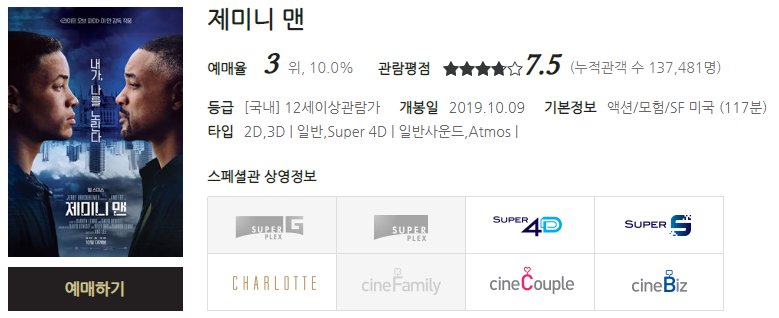 10월 9일 한글날 개봉한 영화 제미니 맨 이영화도 현재 예매순위 3위에 올라와 있는 만큼 주목할만한 영화입니다.
