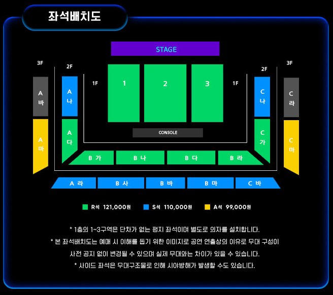 콘서트 지역이 다른만큼 좌석 안내도 또한 각각 다르게 소개되고 있습니다. 대부분 R석이 무대 정중앙으로 구성되어 있어서 출연진들을 관람하기 가장 좋은 자리로 되어있습니다.