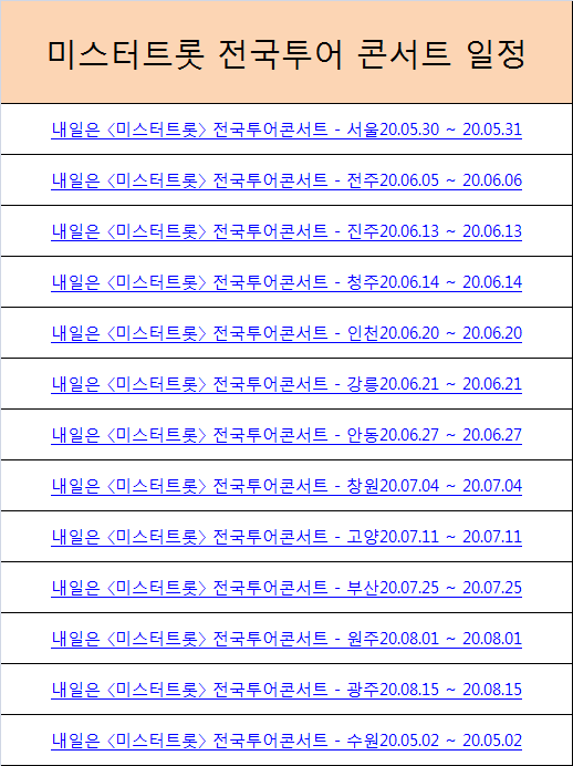 하루빨리 코로나 사태가 종료되어서 기다리던 미스터 트롯 콘서트를 빨리 볼 수 있으면 좋겠네요.