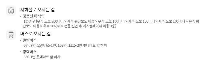 대중교통을 이용해서 올수도 있는데요 인근에 경춘선인 마석역이 위치하고 있습니다. 하지만 롯데마트까지 도보로 10분 정도 소요된다는 점 참고하시기 바랍니다.