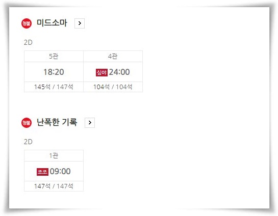 오전 8시 40분 조조할인 영화부터 시작해서 저녁 24시 50분 심야영화까지 매 시간대마다 상영 중입니다.