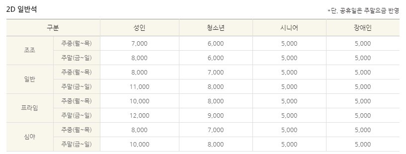공휴일 또한 주말요금에 속한다고 할 수 있으며 일반 영화와 3D영화의 관람료 또한 다르다고 할수 있습니다.