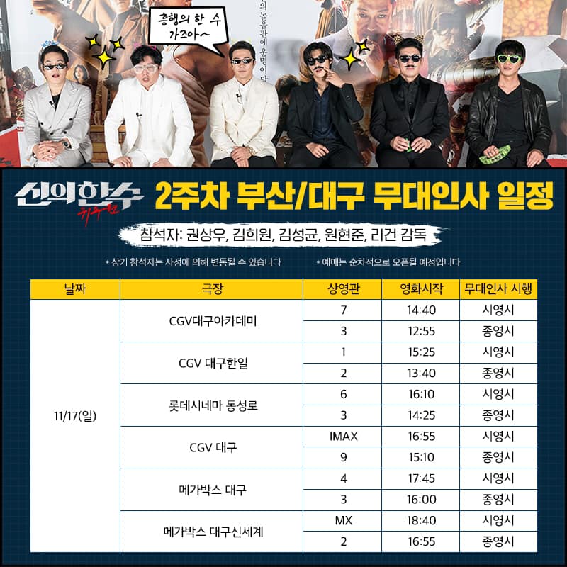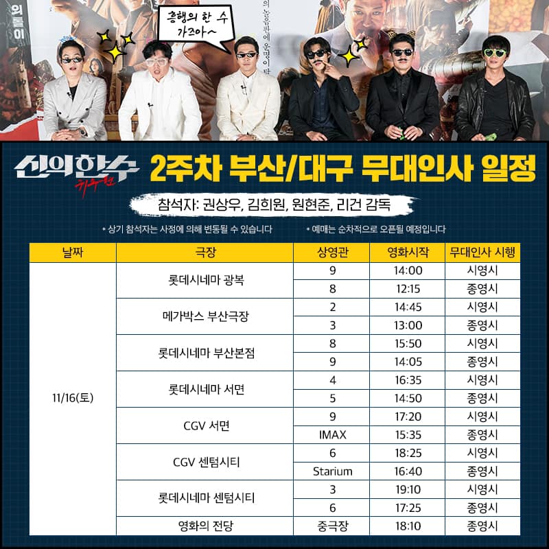 이번에 공개된 신의한수 무대인사 일정을 살펴보면 11월 16일(토)은 부산지역의 영화관에서 예정이 되어있다.