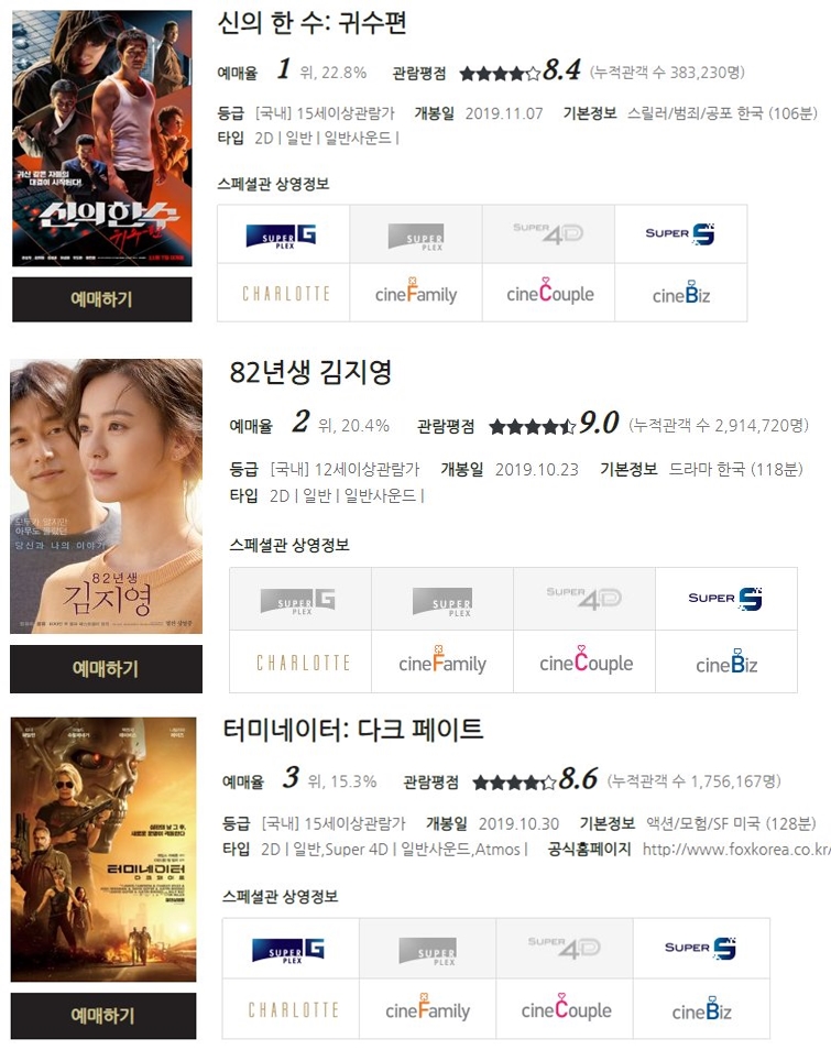 충장로 롯데시네마 상영시간표를 살펴보면 현재 상영작 중에서 신의한 수, 82년생 김지영, 터미네이터 다크 페이트 등이 예매순위 1~3위에 올라 있습니다.