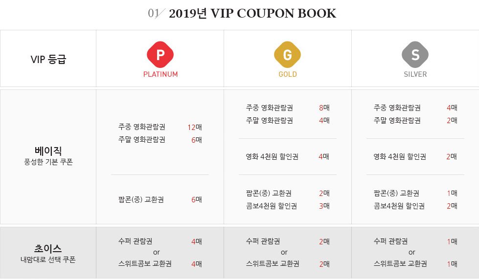 참고로 2019년 VIP 쿠폰북을 살펴보면 플래티넘 등급 무료 영화가 총 18장이나 제공이 되었습니다.