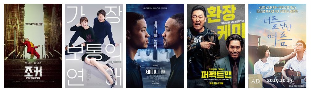 현재 순위를 살펴보면 최근 개봉한 영화들 중에서 조커, 가장 보통의 연애, 제미니 맨, 퍼펙트맨, 장사리 순으로 높은 예매율을 보이고 있습니다.