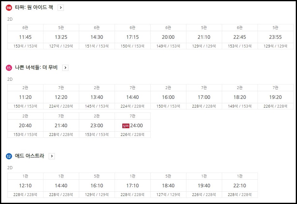 최근 개봉작들은 비슷하지만 상영시간이 다르기 때문에 시간 선택의 폭이 넓은것이 장점이라고 할 수 있습니다.