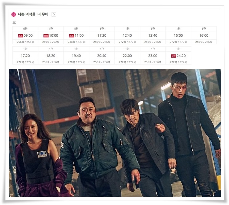 예매순위 1위는 나쁜 녀석들 더 무비입니다. 추석 연휴 기간에도 가장 많은 관객수를 기록한 영화입니다. ocn에서 방영되었던 드라마를 영화로 제작했습니다.