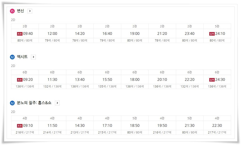 성동일, 배성우 주연의 변신이 오늘 하루 총 8번의 상영이 예정되어 있습니다. 최근 들어 공포영화들이 속속 개봉하고 있습니다.