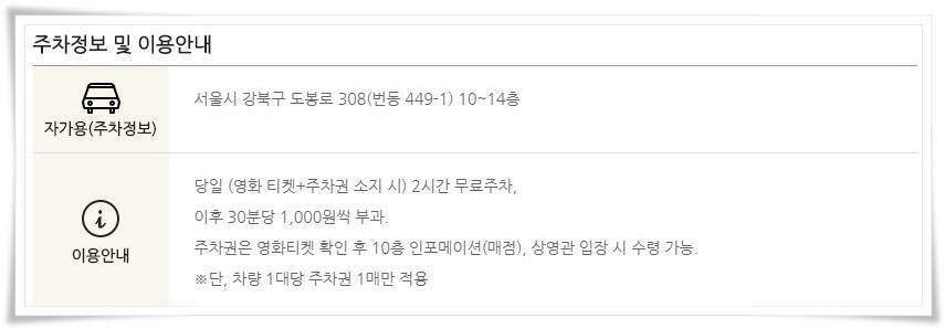 수유 롯데시네마 주차요금의 경우 당일 영화 관람객에게 2시간의 무료주차를 제공하고 있습니다. 이후 30분당 1,000원씩 추가된다는 점 참고하시기 바랍니다.