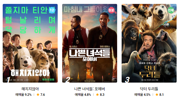 현재 개봉한 많은 영화들 중에서 롯데시네마 예매순위를 살펴보면 해치지 않아, 나쁜 녀석들, 닥터 두리틀이 1~3위에 올라있습니다.