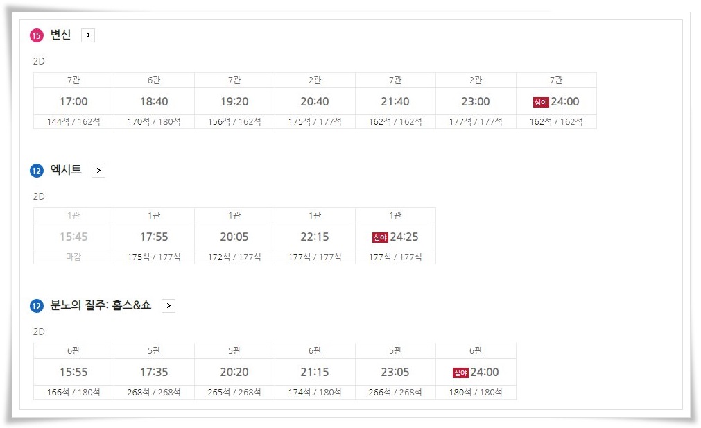 이외에도 다양한 영화들이 상영중인데요 오늘 기준의 서면 롯데시네마 상영시간표는 다음과 같으니 영화예매 시 참고하시기 바랍니다.