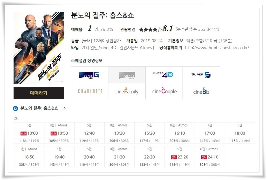영화예매 1위는 분노의 질주 홉스 앤 쇼가 차지했습니다.