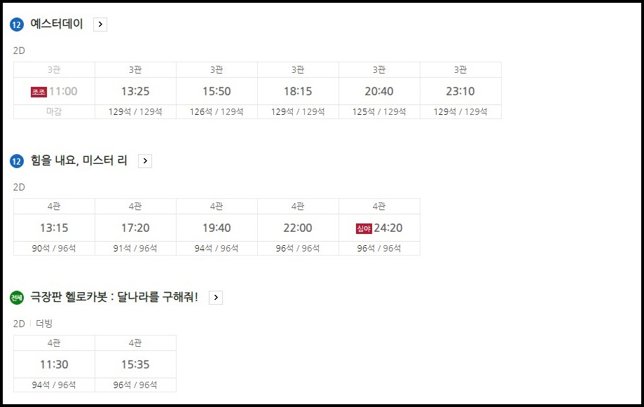 최근 개봉작들은 비슷하지만 상영시간이 다르기 때문에 시간 선택의 폭이 넓은것이 장점이라고 할 수 있습니다.