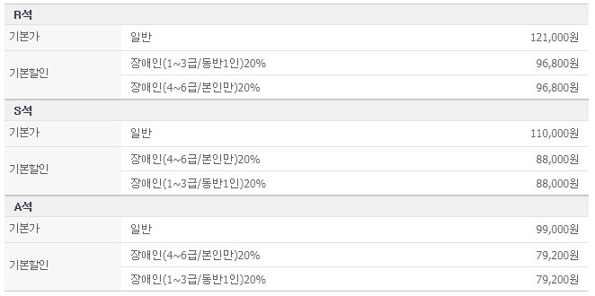 장애인 분들의 경우 할인 혜택도 제공이 되며 각 지역별로 요금이 다르니 콘서트 지역별 요금은 홈페이지에서 확인하시기 바랍니다.