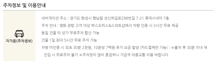 롯데시네마 향남점 주차정보를 살펴보면 당일 영화 관람객들의 경우 3시간까지 무료주차를 제공하고 있다고 안내가 되고 있습니다.