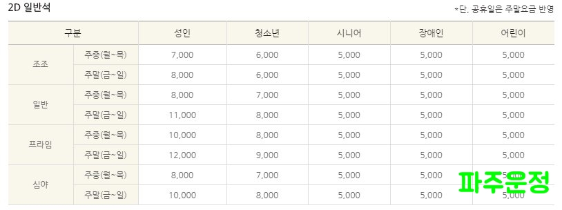 수도권에 비하여 지방에 있는 점의 경우 조금씩 차이가 나는데요 롯데시네마 파주 운정점의 경우 파주 아웃렛점과 동일한 금액으로 요금이 소개되고 있습니다.