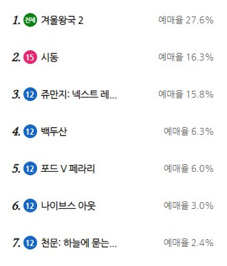 안성 롯데시네마 예매순위를 살펴보면 현재 겨울왕국 2, 시동, 쥬만지 등이 높은 순위권에 위치하고 있습니다.
