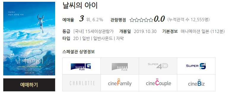 일본 애니메이션 날씨의 아이도 개봉해서 현재 예매 순위 3위에 올라 있습니다.