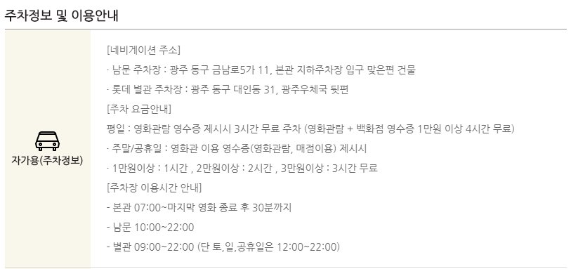 백화점 주차장을 함께 이용할 수 있는 점이 장점이며 당일 영화 관람 시 3시간의 무료주차를 제공받을 수 있습니다.
