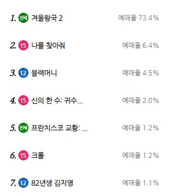 롯데시네마 영화예매순위를 살펴보면 많은 개봉작 중에서 겨울왕국 2편이 가장 높은 예매율을 보이고 있습니다.