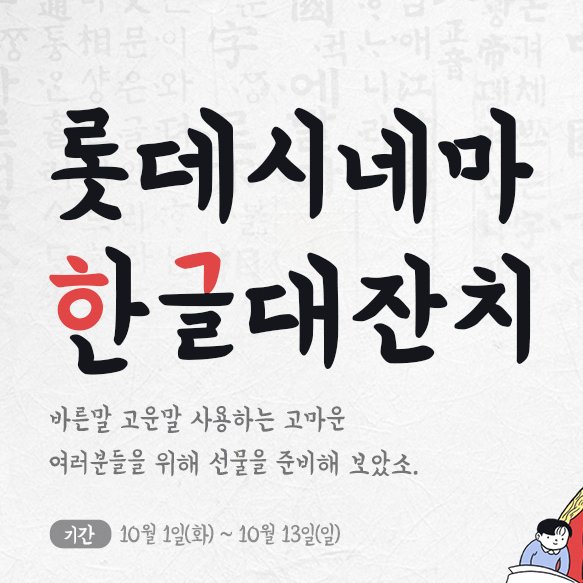 한글날을 맞이하여 전국의 롯데시네마에서 한글날 이벤트를 진행한다고 합니다.