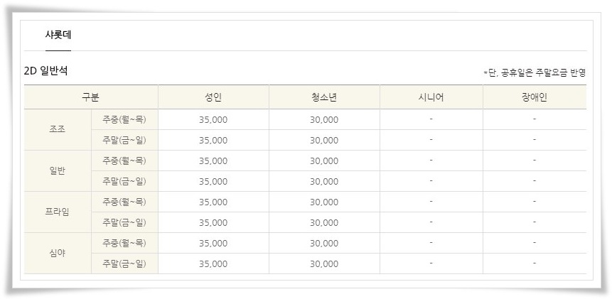 프리미엄 서비스인 만큼 안산 롯데시네마 샤롯데관 가격은 주중, 주말 관계없이 1인당 35,000원입니다.