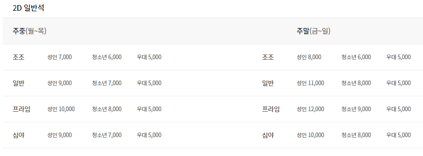 대부분의 영화관들과 마찬가지로 주말요금이 좀더 비싼 편이라 할 수 있는 만큼 주말에 영화 관람 계획을 갖고 있다면 다양한 롯데시네마 할인 혜택들도 있으니 확인해 보시는 것도 좋습니다.