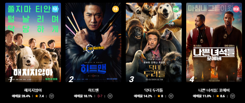 최근개봉한 해치지 않아, 개봉 예정인 히트맨, 닥터 두리틀, 나쁜 녀석들이 영화예매순위에서 상위권으로 많은 사랑을 받고 있습니다.