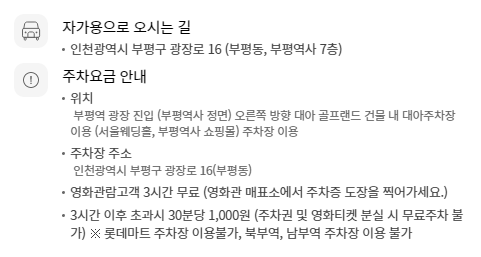 부평역 롯데시네마 주차정보를 살펴보면 대부분의 영화관들과 마찬가지로 무료주차를 제공하고 있습니다.