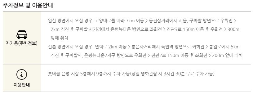 은평몰 롯데시네마 주차요금을 살펴보면 당일 영화 관람객들에게 3시간 30분의 무료주차를 제공하고 있습니다. 넉넉한 주차시간까지 제공되니 주차 걱정 없이 영화 관람하기에도 좋은 것 같습니다.
