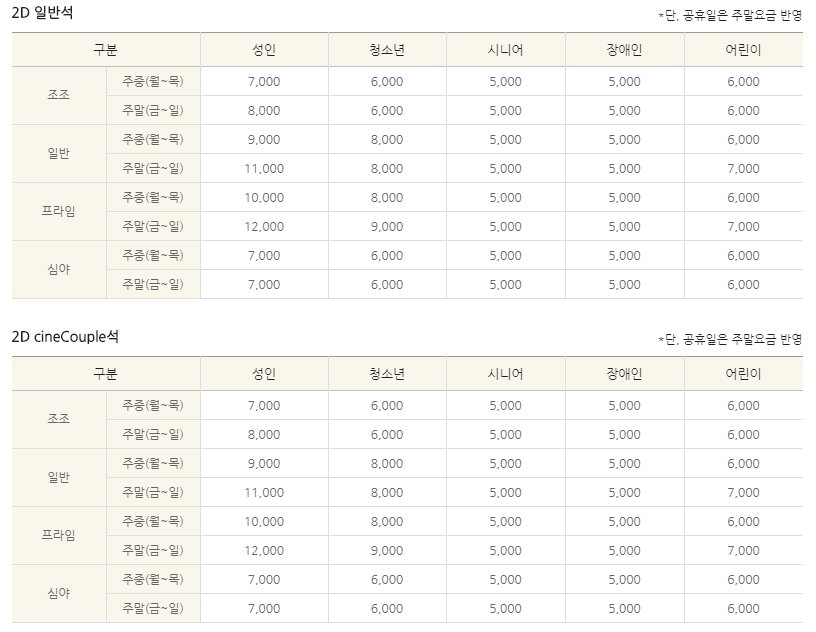 영화 관람요금을 살펴보면 일반석과 커플석 모두 주중 요금은 차이가 없이 9,000 원으로 소개가 되고 있습니다.