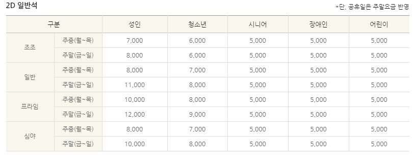 파주아울렛 롯데시네마 상영요금을 살펴보면 주중 및 주말 영화관람료 및 3D 영화에 따라서 가격이 다르게 소개되고 있습니다.